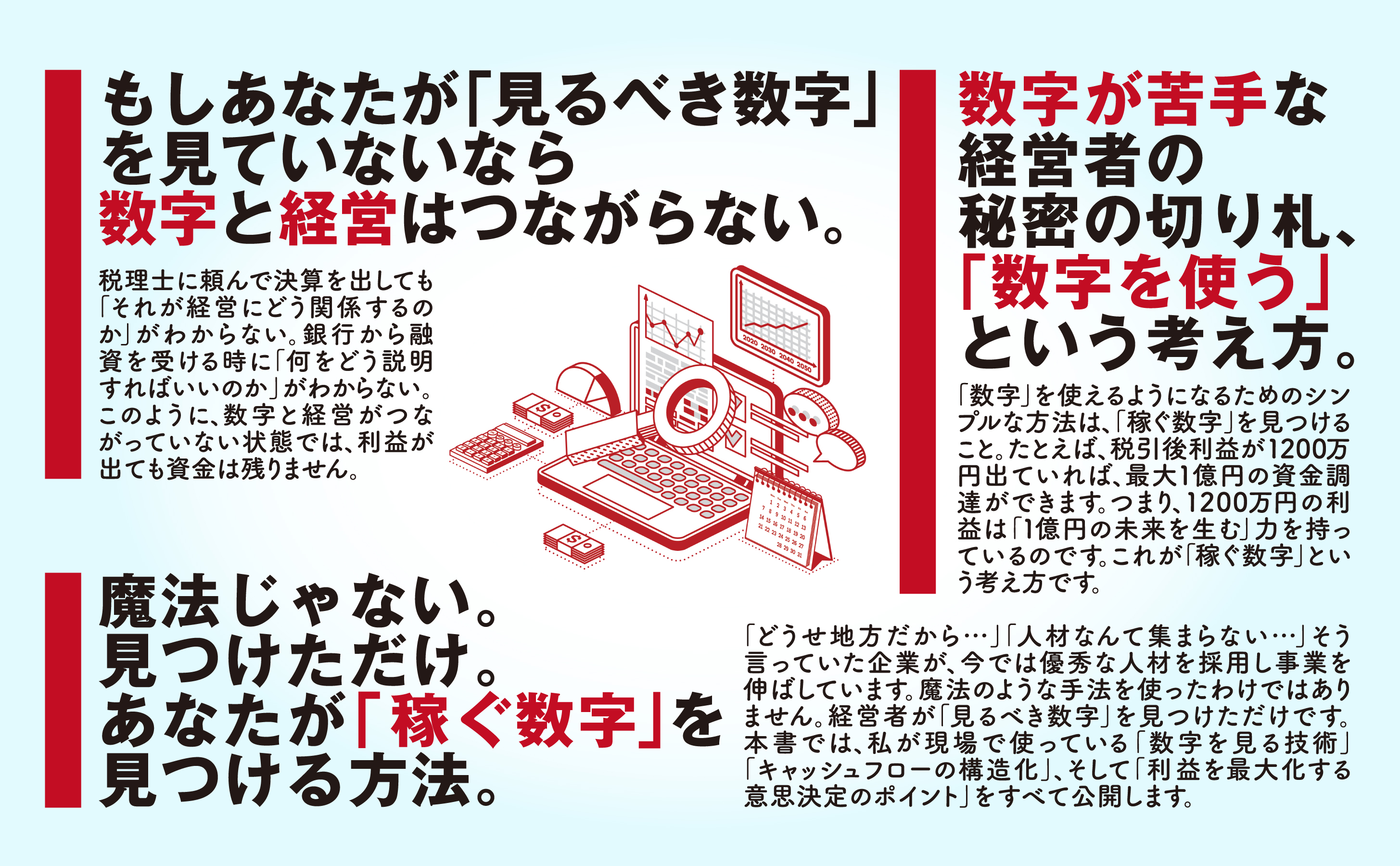 本書は、「稼ぐ数字」を知り、会社を一瞬で利益重視の儲かる会社になるための最強ノウハウを伝える。