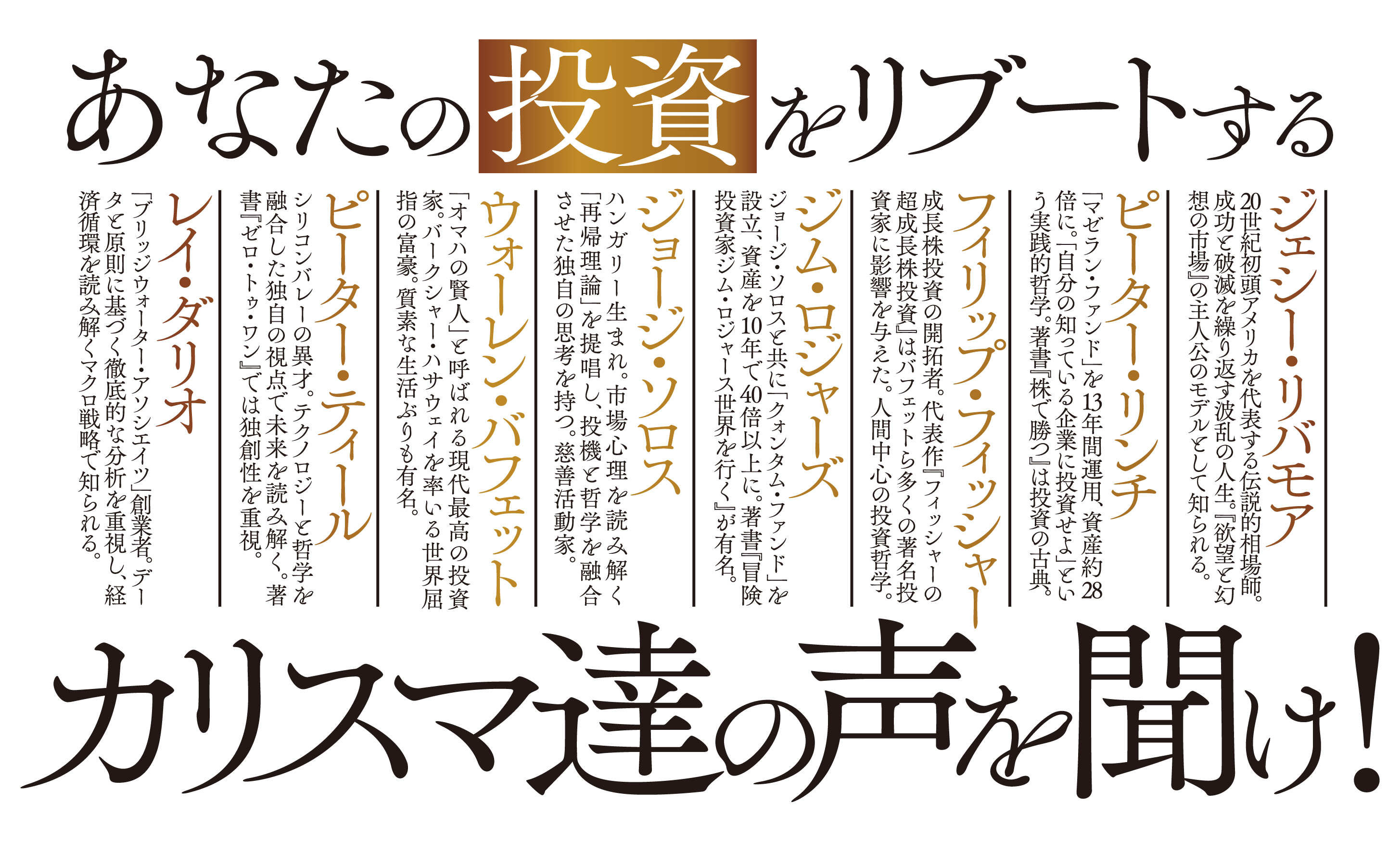 ジョージ・ソロスと共に「クォンタム・ファンド」を設立し、10年間で資産を40倍以上に増やした名投資家。世界各地を旅しながら経済や市場の動向を見極める“現場主義”で知られる。コモディティや新興国への先見性にも定評があり、著書『冒険投資家ジム・ロジャース世界を行く』が有名。